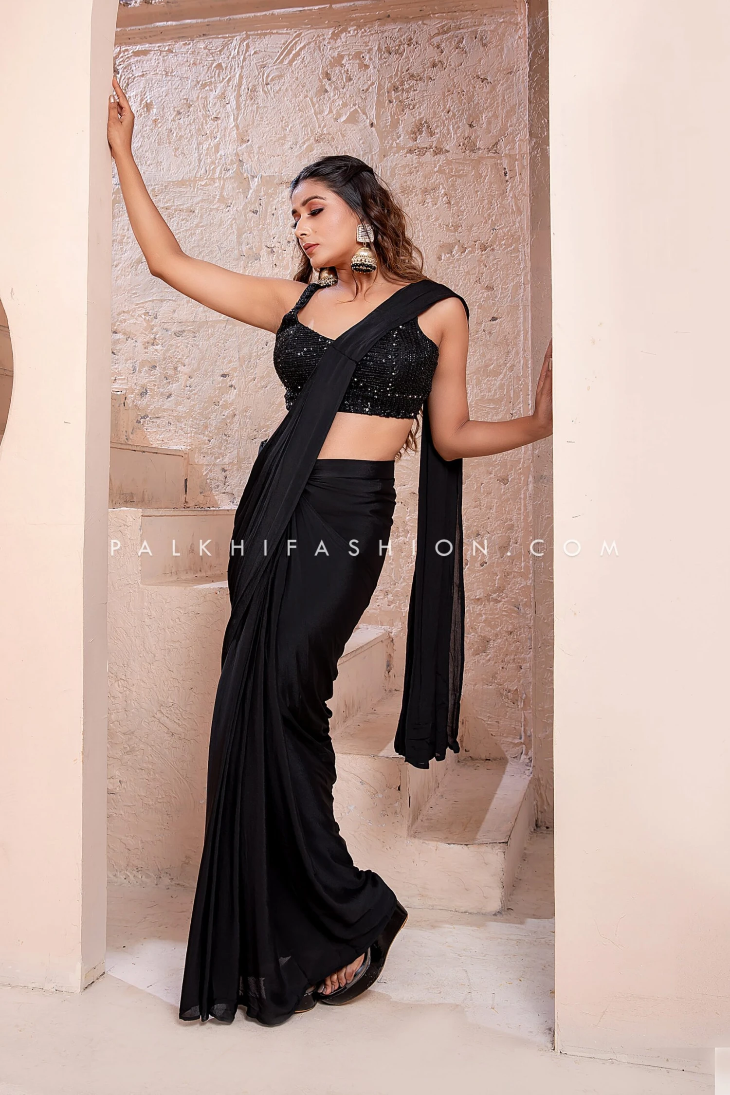 A goddess-like aura comes with this black ready-to-wear saree from Palkhi Fashion. Delicately crafted crepe silk pre-stitched drape saree paired with handwork blouse. Blouse adorned with appealing style along with petite stones, beads embroidery, sequin, and handwork embellishments.