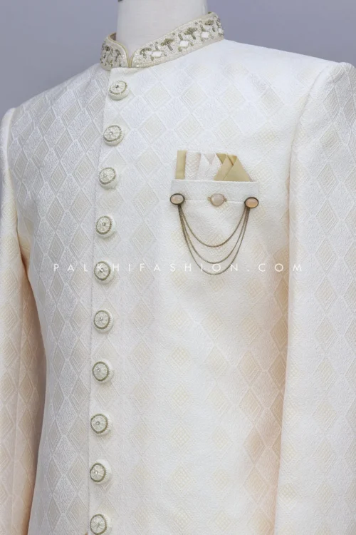 Change your ethnic collection with this dark green silk indo-western. Features zardosi, stones, silk weaving, and cutdana work. Detailed with a stand collar, and full placket, hook, and summary opening. Comes with contrast beige color pants.