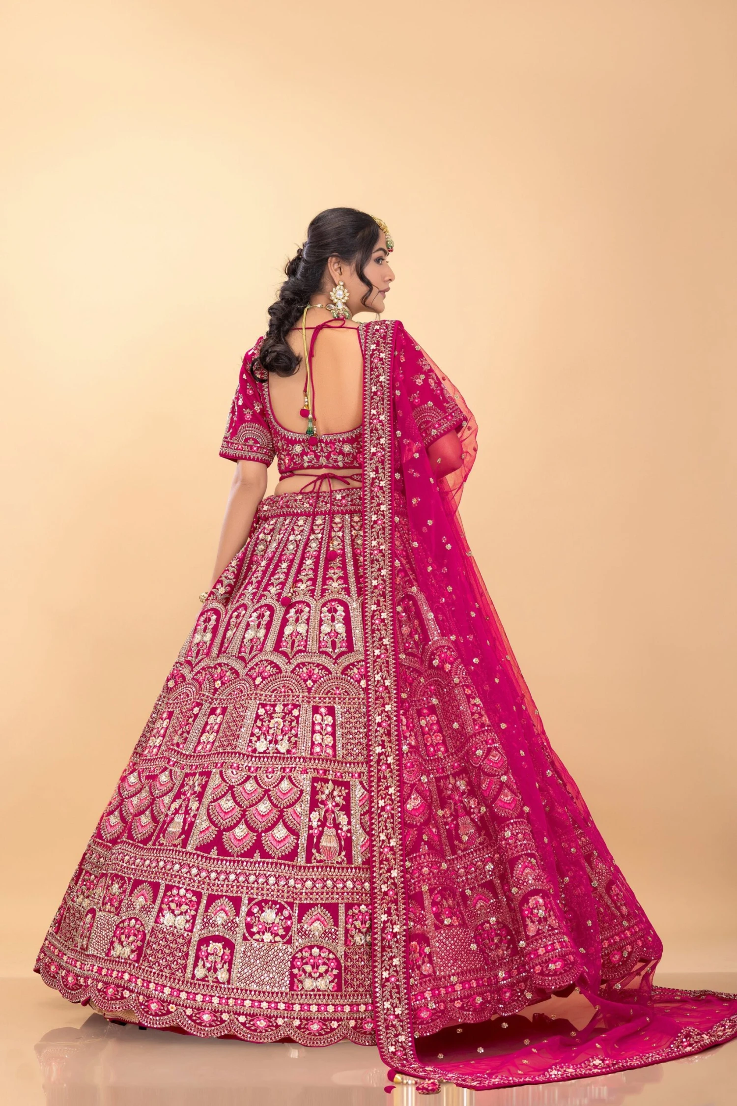 Embark on your fairytale wedding in this Rani Pink Velvet Bridal Designer Lehenga Choli from Palkhi Fashion. This exquisite ensemble features a luxurious velvet lehenga adorned with shimmering petite stones, kundan, delicate threadwork, elegant zari embroidery, handwork, and sequin work. The attractive designs and rich texture create a look of unparalleled sophistication, fit for a queen. The matching blouse is embellished with intricate handwork and features a beautifully designed back. Complete with a matching soft net dupatta and an embroidered belt, this lehenga choli is perfect for your special day.