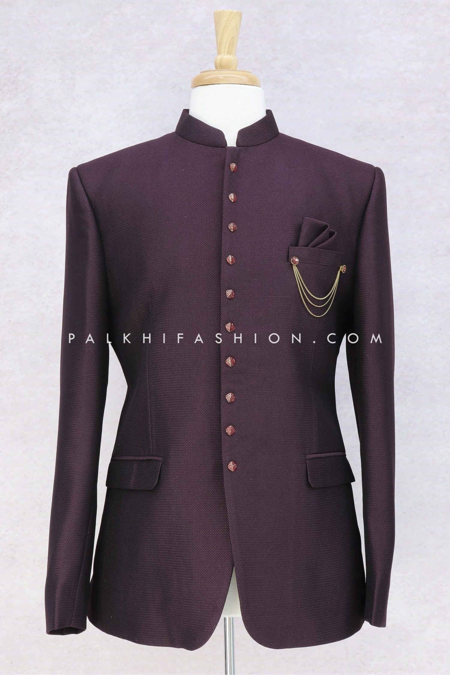 Attractive look in wedding and ethnic function with this dark wine jodhpuri sui from palkhi fashion. Features imported fabric, stand neck, full sleeves, full summaryed placket, one welt pocket, and vented hem. Features elegant summarys and matching brooch. Paired with matching pants.