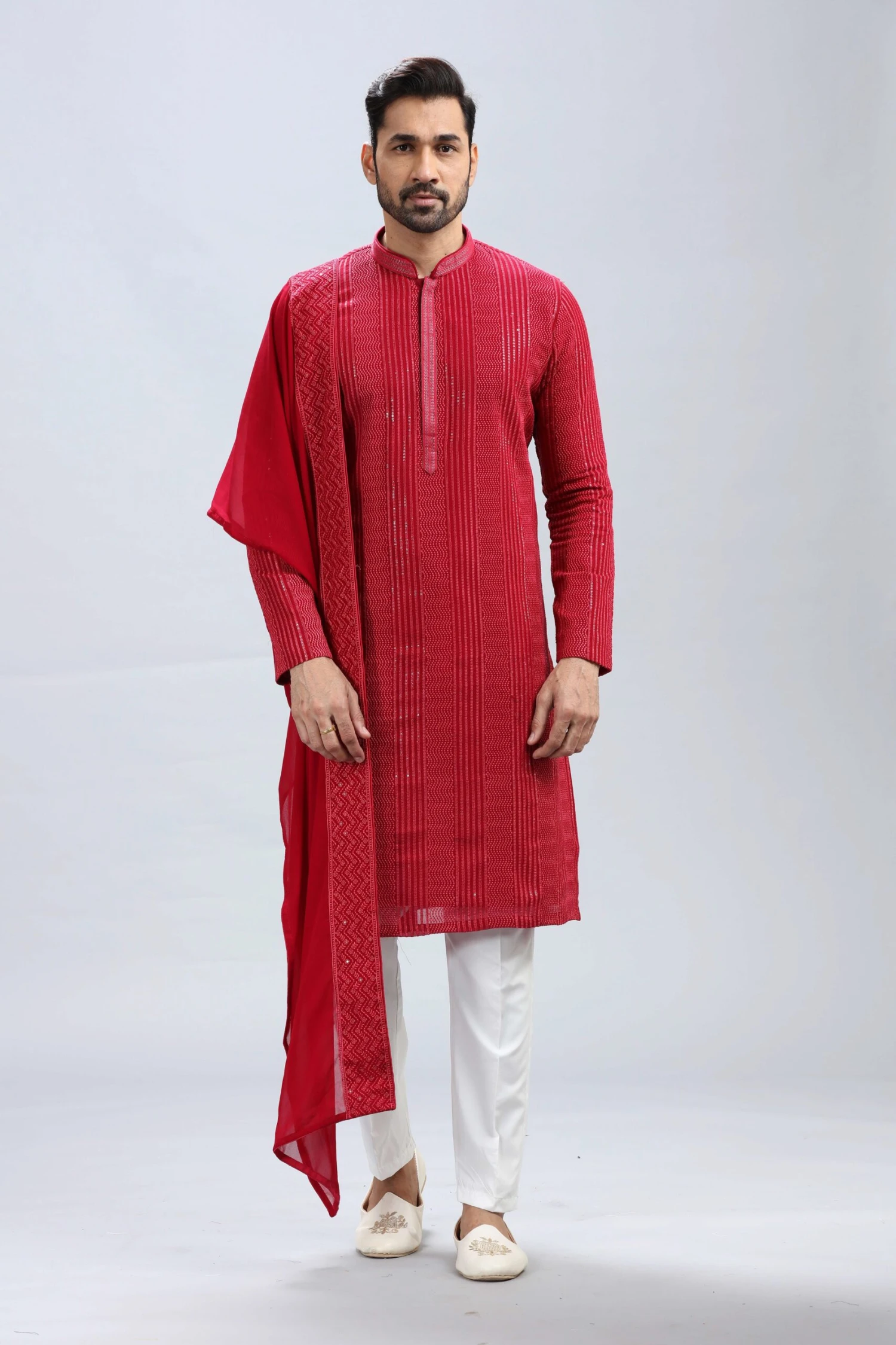 Step into refined elegance with this Red Georgette Kurta Pajama Set from Palkhi Fashion, beautifully crafted with intricate threadwork and petite sequin embroidery that forms a timeless, enchanting pattern. The embroidery gracefully enhances the fabric, offering a perfect blend of traditional artistry and modern sophistication. Comes with matching dupatta and pants.