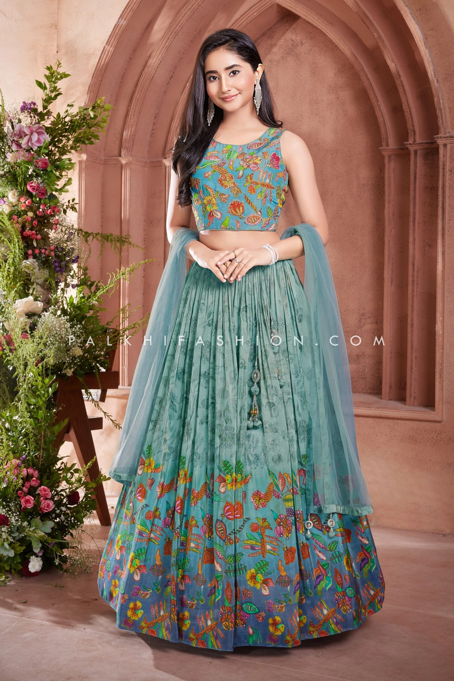 Light Teal Girls Lehenga Choli | Soft Silk & Prints | Palkhi Fashion