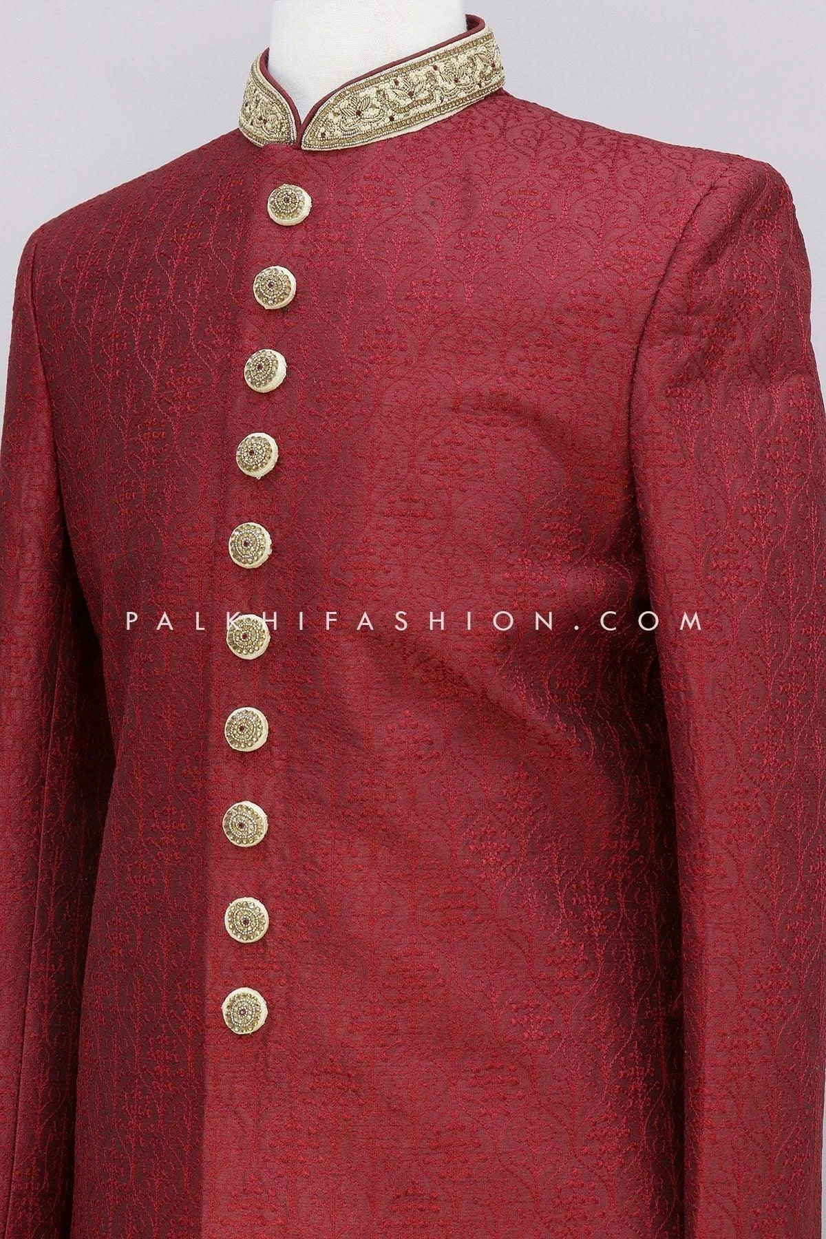 Change your ethnic collection with this maroon pure silk indo-western from palkhi fashion. Features thread weaving and embroidery work. Detailed with stone work and handwork collar, and full placket, hook, and summary opening. Comes with contrasting pants.