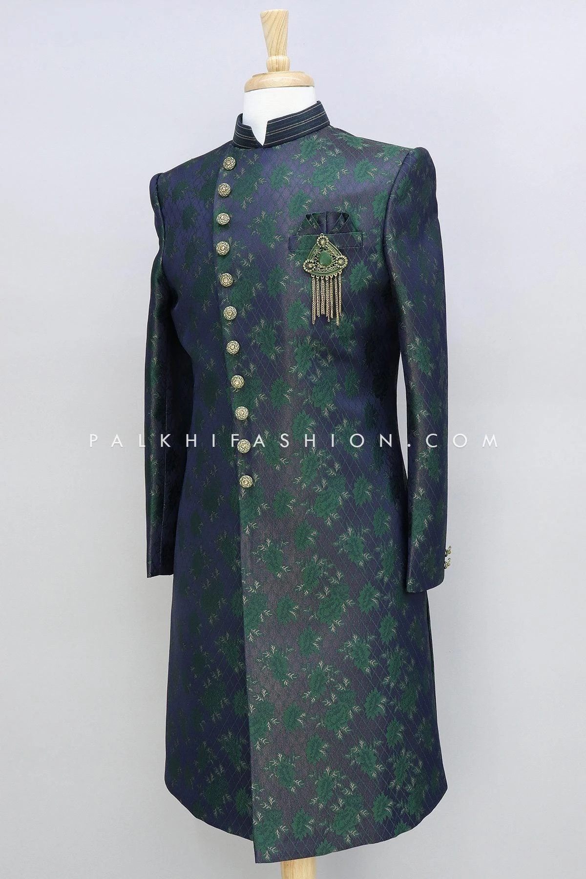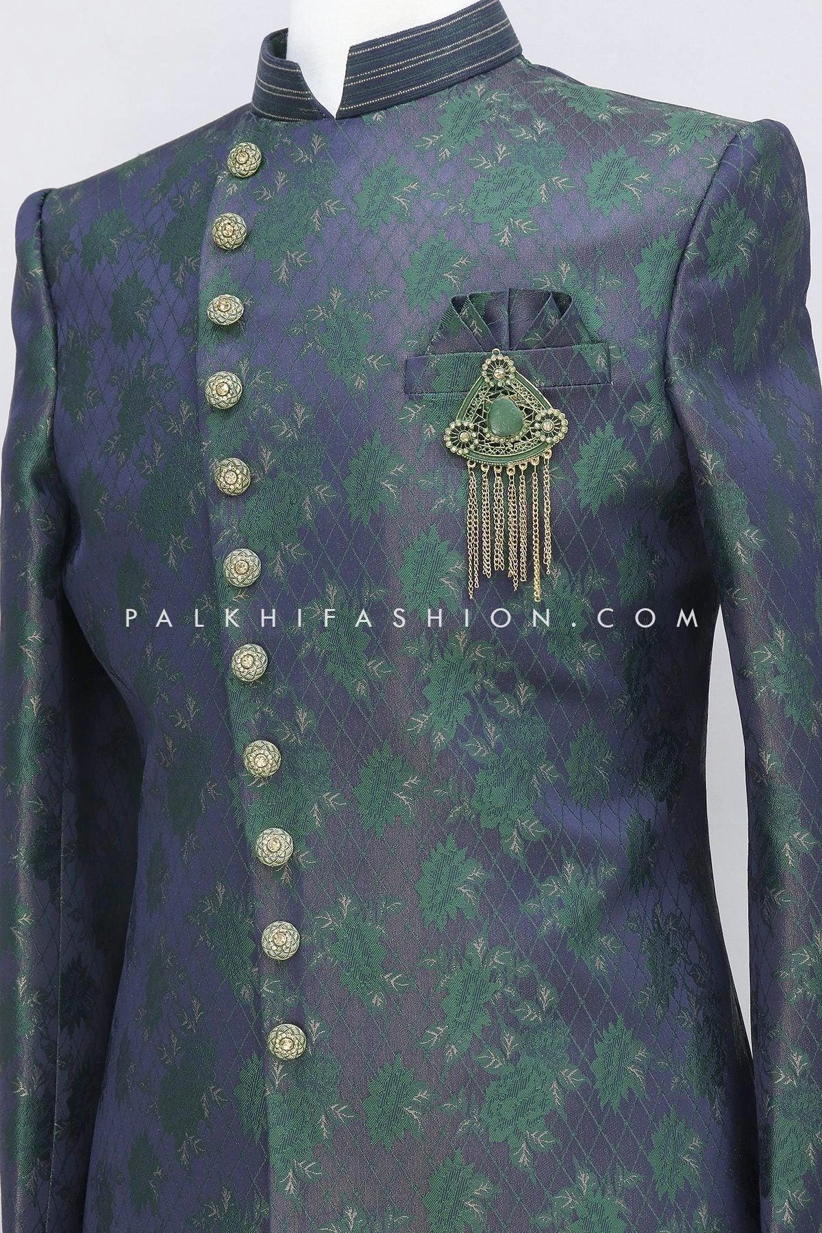 Attractive look in wedding and ethnic functions with this blue pure silk indo-western. Features appealing green embroidery designs, thread, and jacquard work. Detailed with stone work summarys, stand collar, and full placket, hook, and summary opening. Paired with a brooch and straight vented hem. Comes with Matching pants.