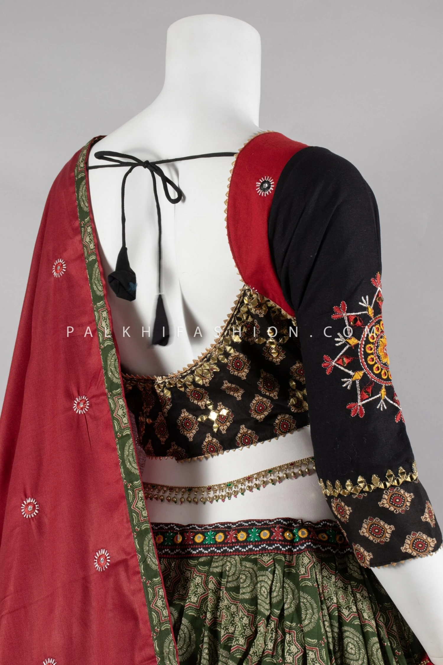 Immerse yourself in the vibrant spirit of Navratri with this Multicolor soft cotton Chaniya Choli Set from Palkhi Fashion. The lehenga features a full flair adorned with multi-color traditional thread work, ajrakh prints, gamthi embroidery & mirror embellishments. The matching blouse is intricately designed with mirror work, multi-color thread embroidery, gamthi, and kutchi embroidery, complemented by attractive sleeve designs and detailed front and back patterns. A contrasting maroon embroidery work dupatta completes this vibrant ensemble, perfect for festive occasions.