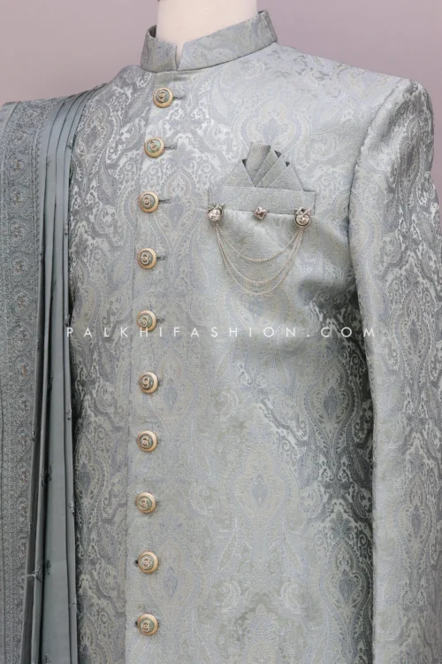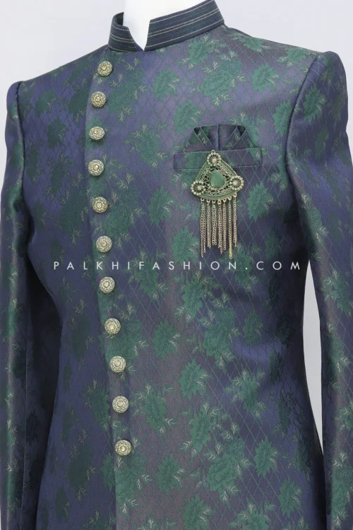 The Jodhpuri Suit from Palkhi Fashion is a mesmerizing ensemble that exudes timeless elegance and regal charm. This exquisite suit is a perfect blend of traditional craftsmanship and contemporary style. The suit features a classic soft silk navy blue jodhpuri jacket adorned with trousers. Features elegant summarys and a detachable brooch. With its rich fabric, impeccable design, and impeccable tailoring, the Jodhpuri Suit from Palkhi Fashion is a true masterpiece that embodies the grace and grandeur of Indian heritage, making it a standout choice for special occasions and formal events.