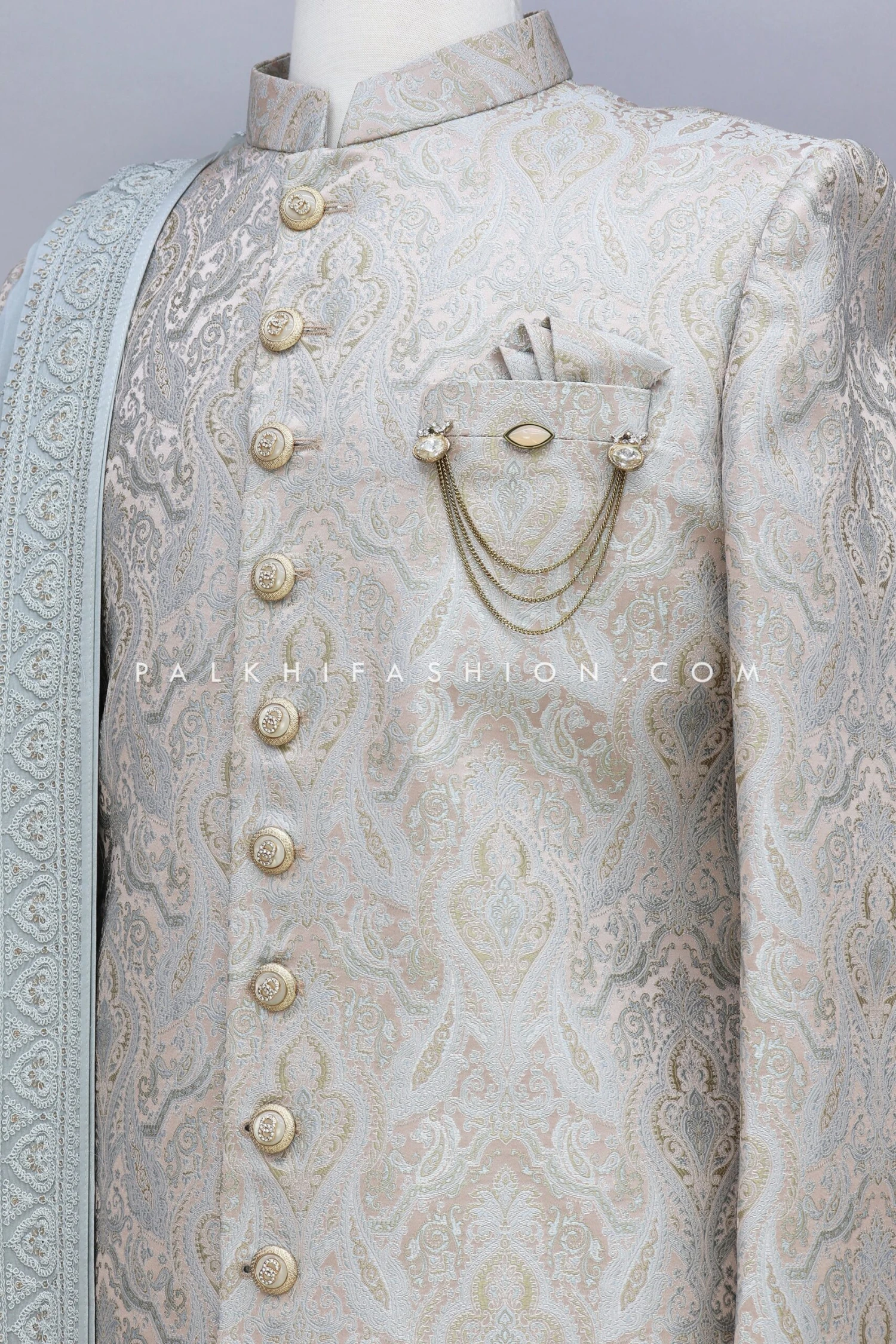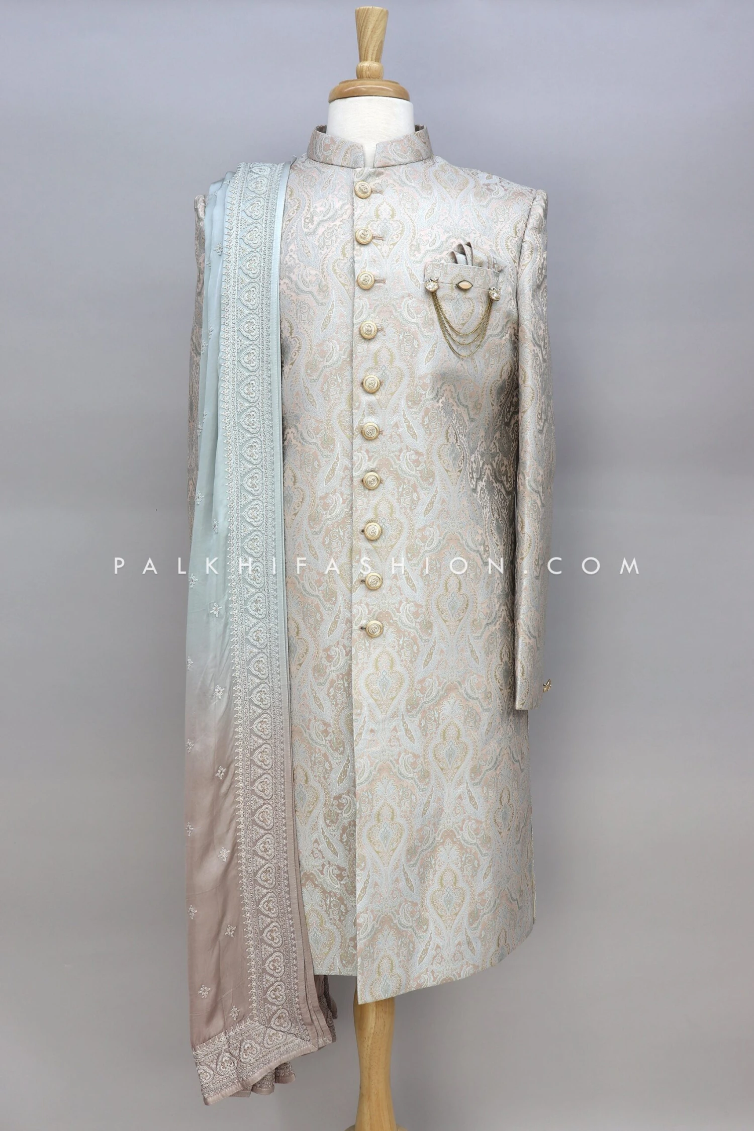 Charm all hearts adorning this pastel color indo-western from palkhi fashion. Features in soft silk, and handwork. Detailed with stand collar, full placket, and summary opening. Comes with a shaded embroidery work dupatta, which adds extra charm to it.