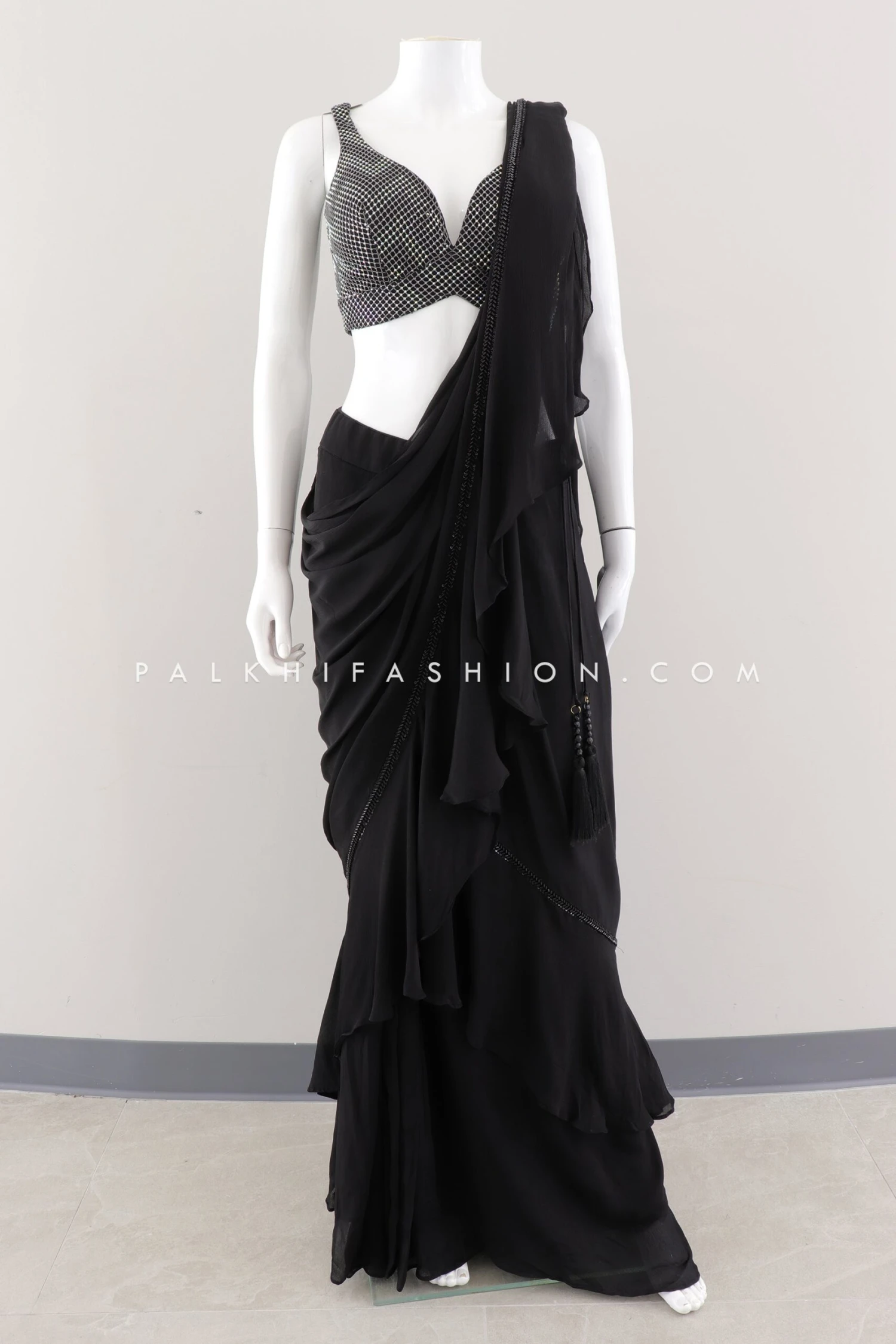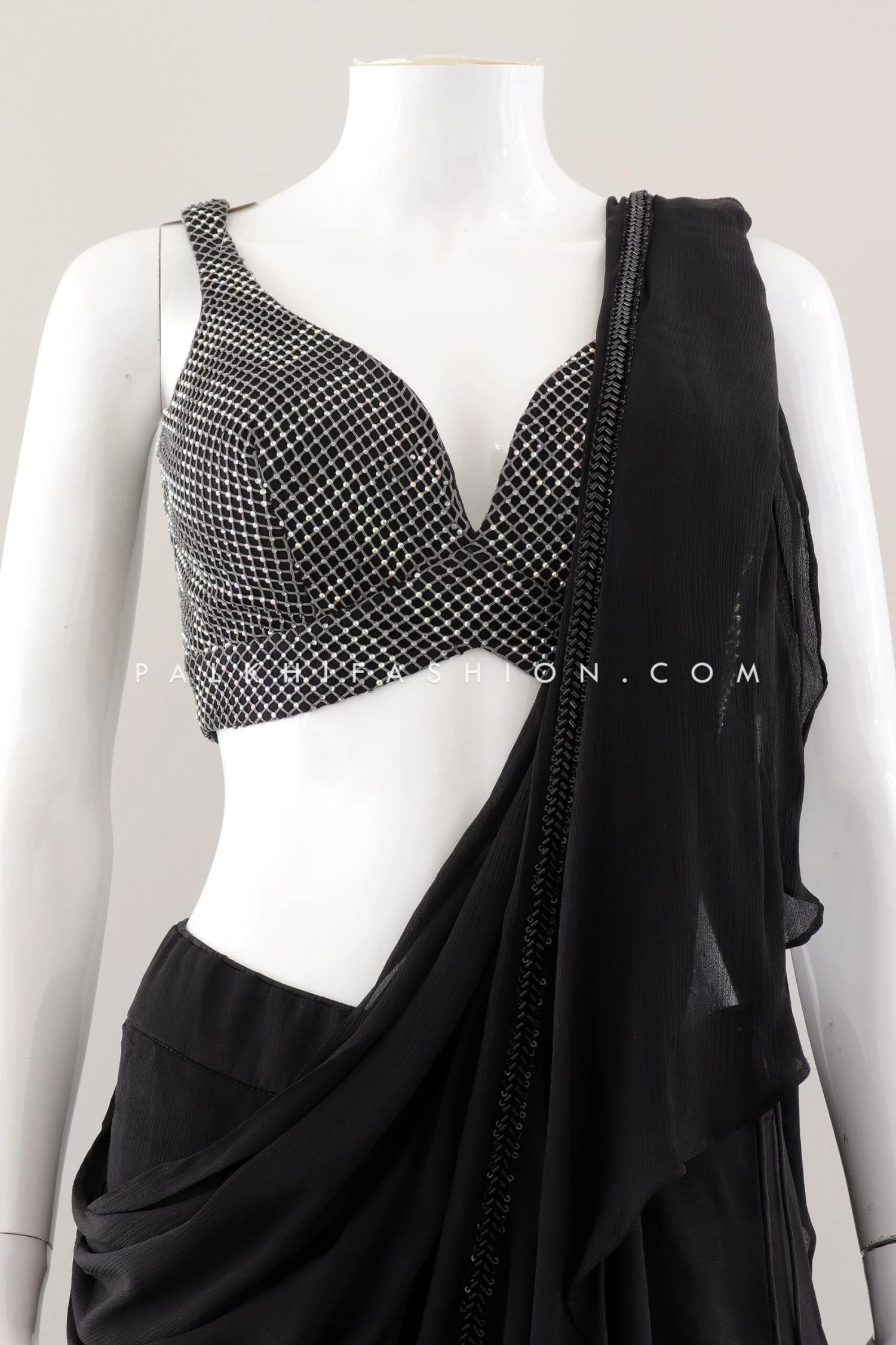 Pre-Draped Black Saree With Stone, Sequin, And Embroidery Work