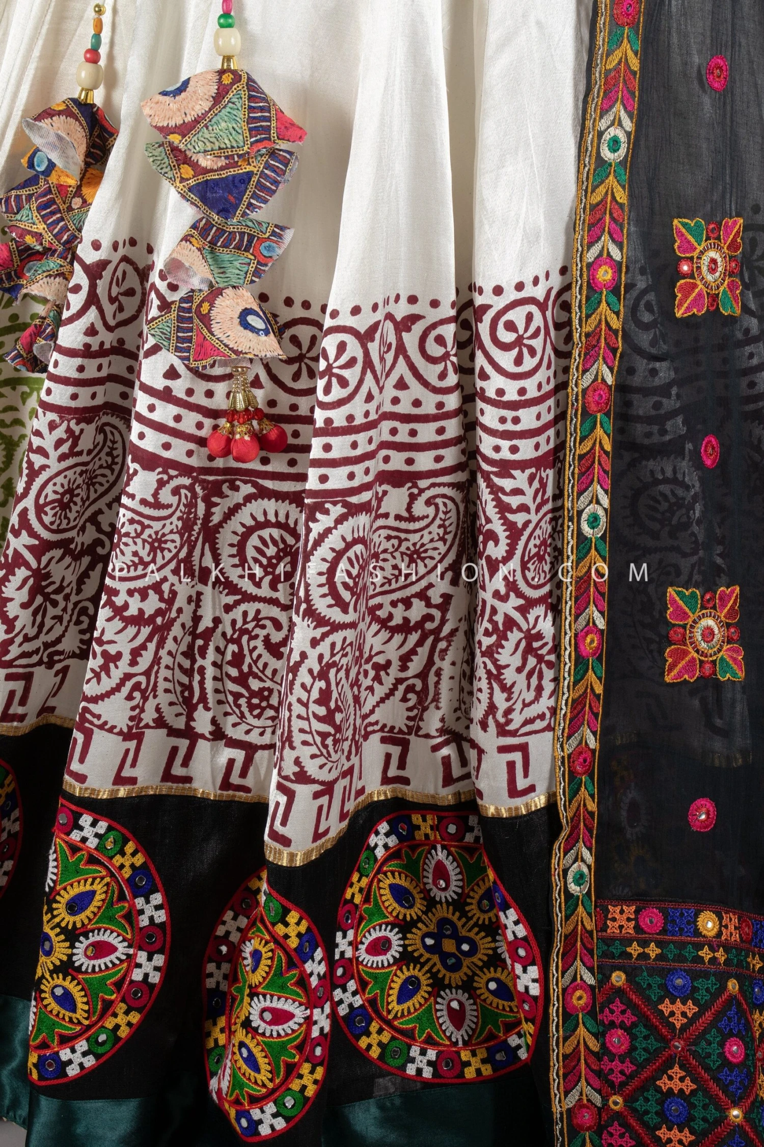 Celebrate Navratri in timeless elegance with this Pure Gaji Silk Chaniya Choli from Palkhi Fashion. The full-flair lehenga is adorned with multi-color block prints, traditional thread work, gamthi embroidery, abhala embellishments, and intricate kutchi patchwork. The matching blouse features multi-color thread work, gamthi and kutchi embroidery, and vintage artistry, complemented by attractive sleeve designs and detailed front and back patterns. A black cotton silk dupatta with kutchi embroidery completes this exquisite ensemble.