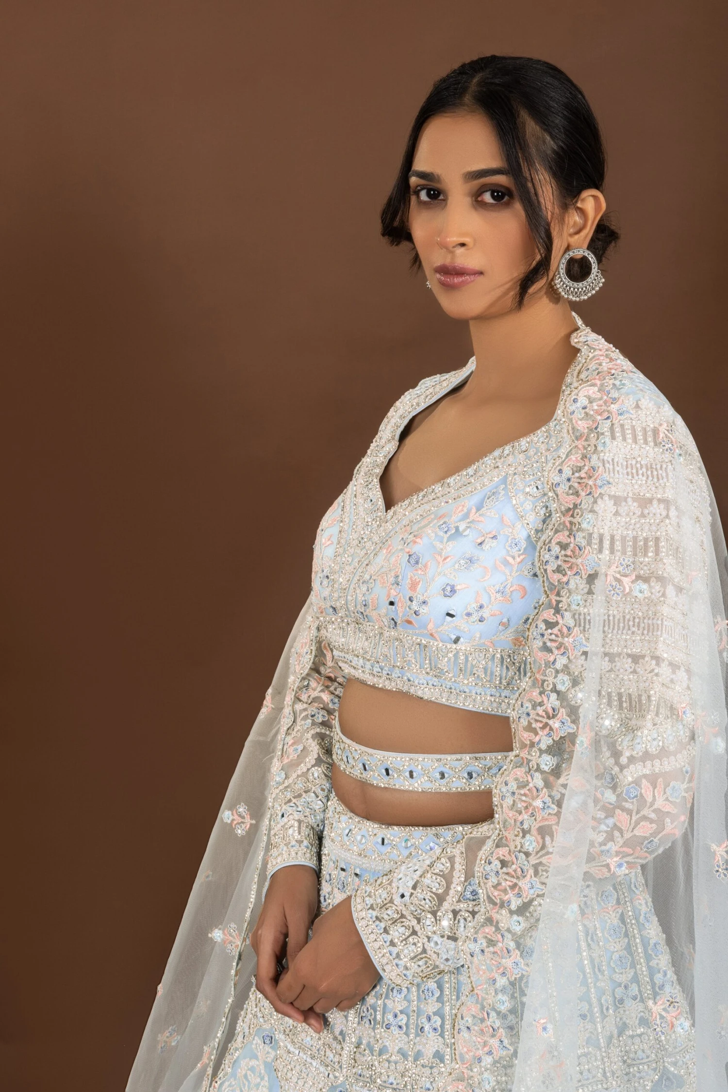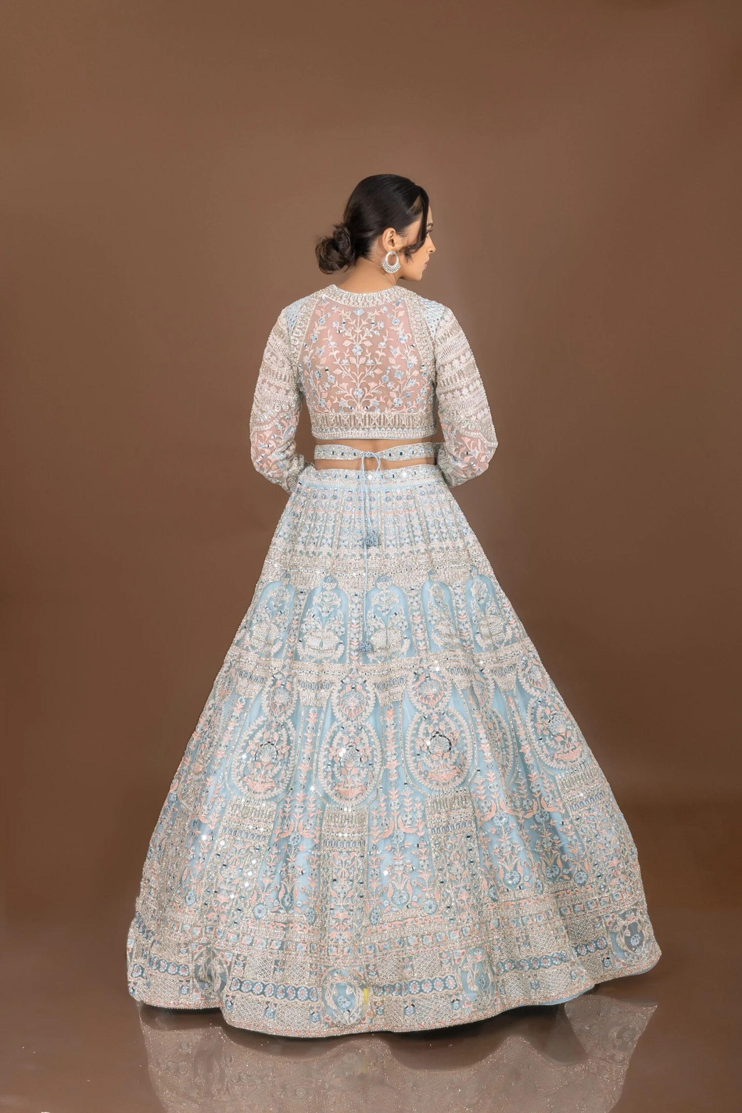 Be the first to review “Regal Glam: Powder Blue Designer Lehenga Choli With Mirror And Pearl Work” Cancel reply