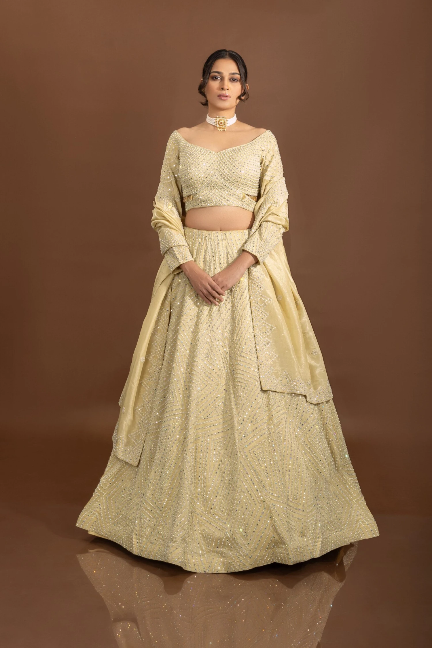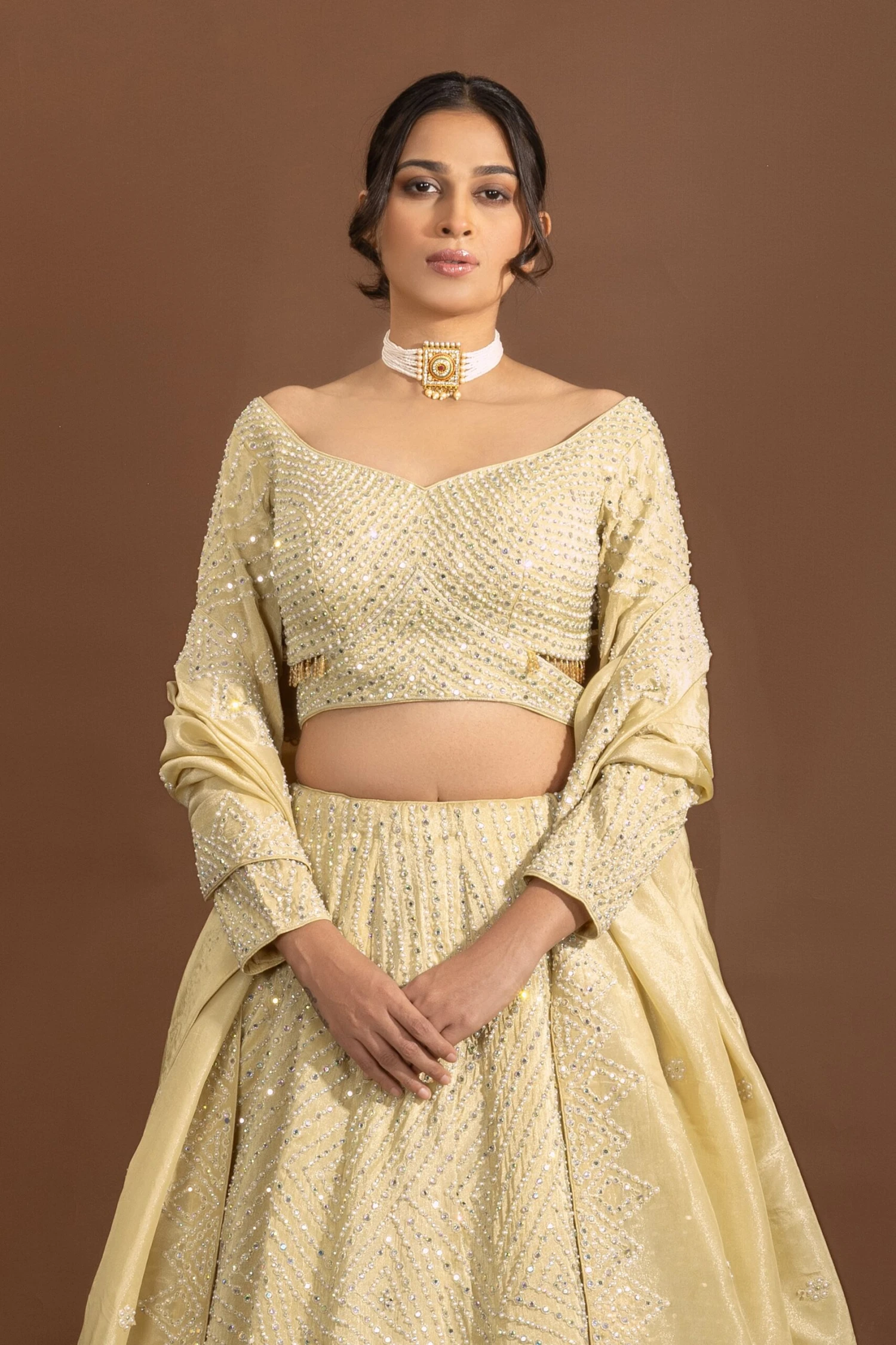 Royal Weaves: Lavish Beige Silk Designer Lehenga Choli With Pearls And Mirrors