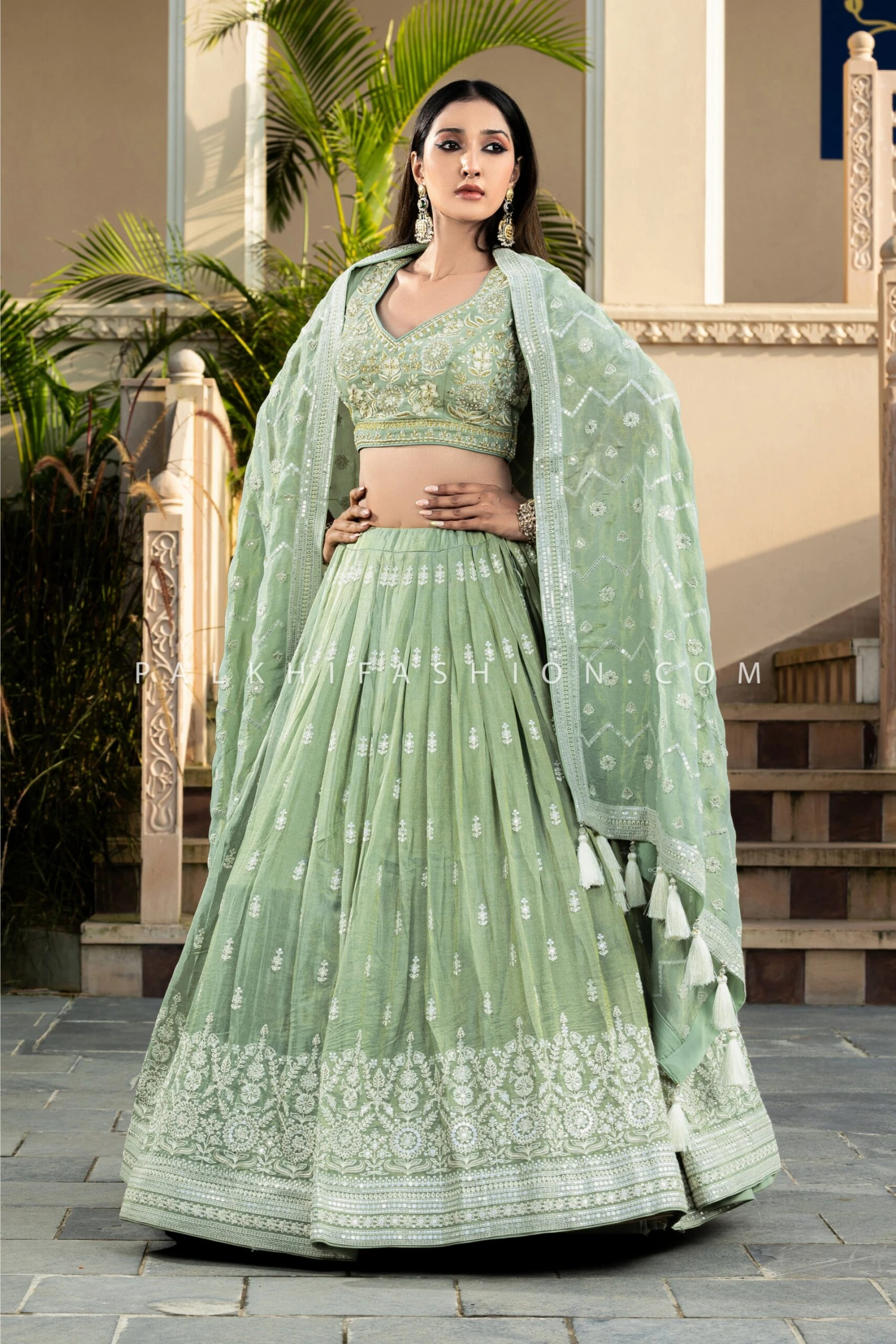 Sage Green Soft Silk Lehenga Choli | Chikankari & Handwork | Palkhi Fashion