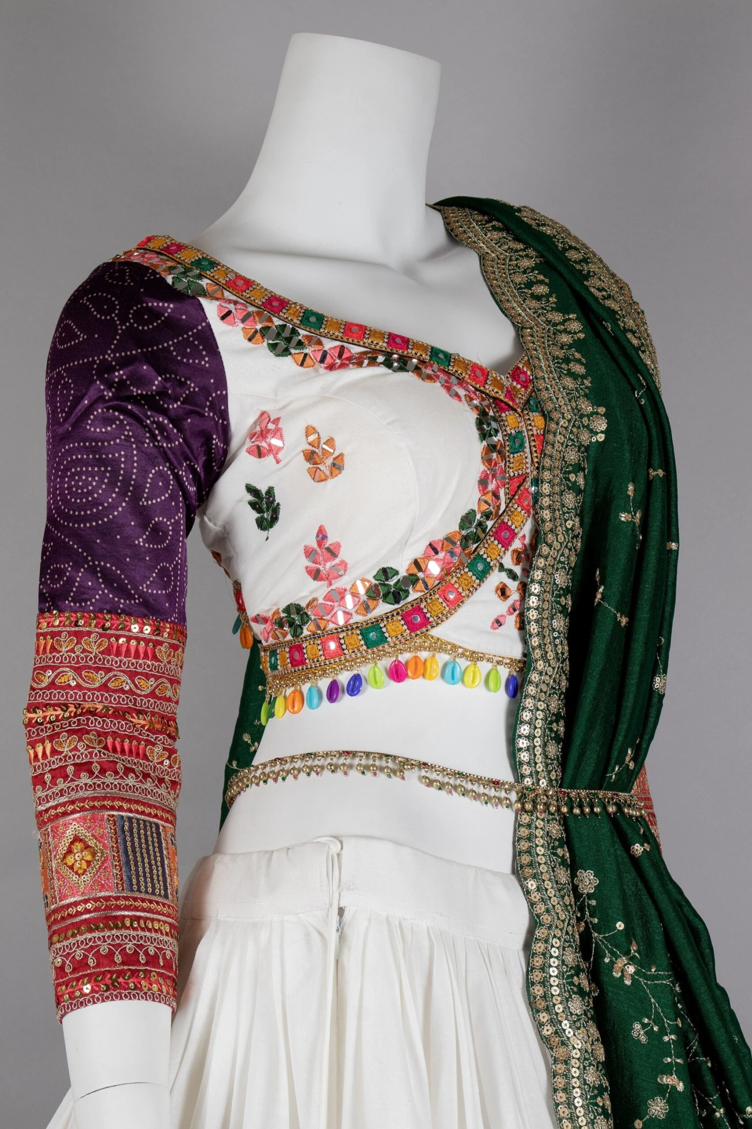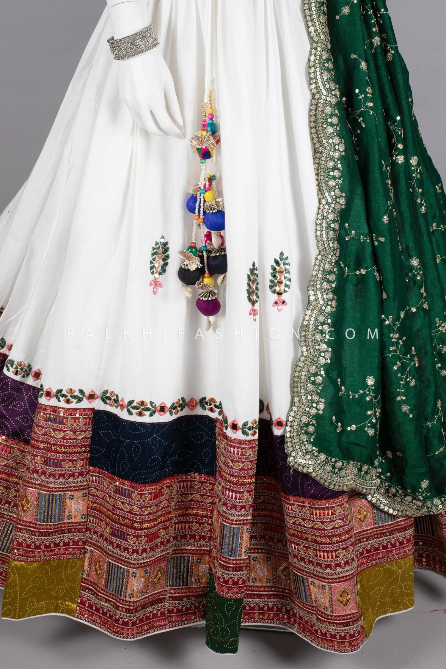Radiate timeless beauty in Navratri garba with our exquisite White Designer Chaniya Choli. This stunning ensemble from Palkhi Fashion is a masterpiece of intricate craftsmanship. The pristine white canvas is adorned with a vibrant palette of colors through exquisite vintage work, gamthi work, delicate embroidery, mirror work, stone, kutchi artistry, traditional patchwork, and pure gaji silk patch work. The matching blouse with mirror work, multi-color thread embroidery, and pure gaji silk work complements the Chaniya’s allure, while the green vintage work dupatta adds a bold pop of color.
